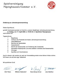 Am 17. April findet unsere Jahreshauptversammlung statt. Die Einladungen sollten in den nächsten Tagen bei jedem Vereinmitglied im Briefkasten landen. Los geht es um 19 Uhr im Sportheim Päpinghausen.